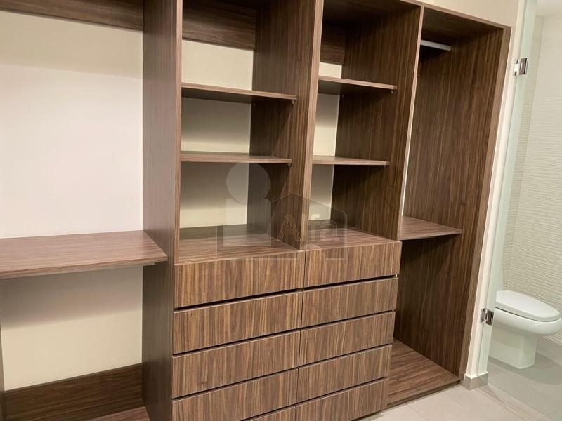 Departamento en renta en Mitikah torre residencial, Benito Juárez, Xoco, Ciudad de México. Ubicado en un piso 5 con dos recámaras. La principal con baño y vestidor, la secundaria comparte baño en pasillo con visitas. Cocina abierta, área de lavado, sala comedor. Mantenimiento incluido en la renta.